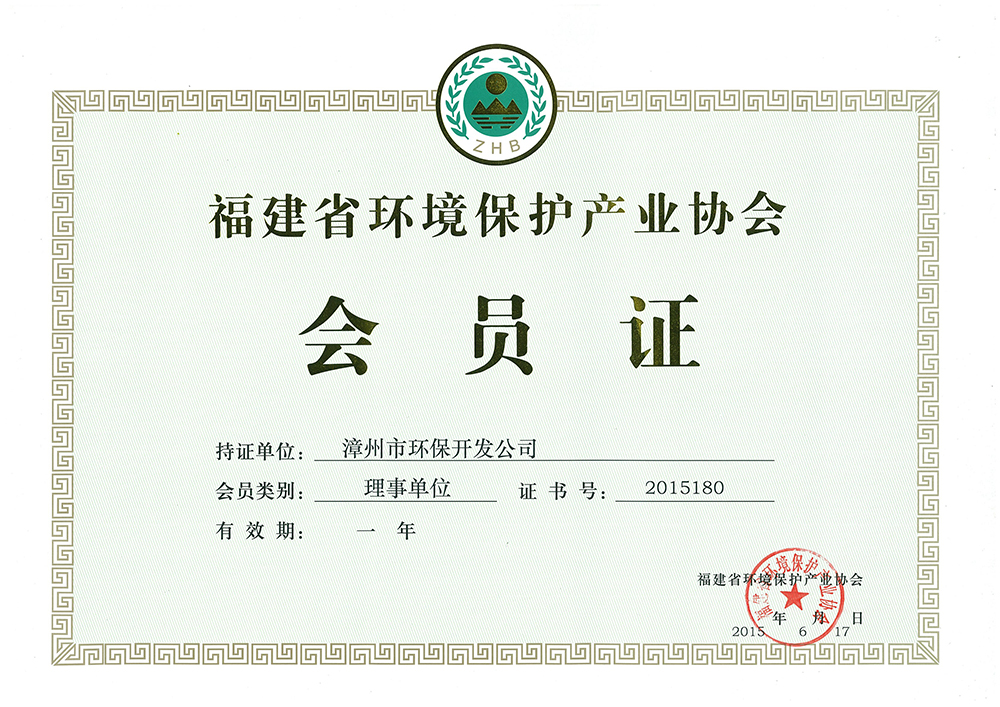 • 福建省環(huán)境保護(hù)產(chǎn)業(yè)協(xié)會會員證