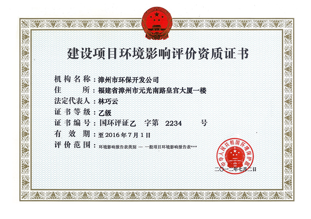 • 建設(shè)項(xiàng)目環(huán)境影響評價資質(zhì)證書